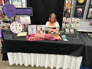 A short while after the convention opened for the VIP early preview a coordinator told our entire row that if we had the ability to spread to the remaining booths on the row that were empty (there were three – 2 of which were confirmed not coming and 1 that hadn’t heard anything back yet) that we should. After waiting for about twenty minutes (it seemed longer) to hear about the third booth Ellen and I decided to move my pins and setup on the empty table. Dina from Fandom Threads Studio loaned me a basket for the few knitted items I had on hand and Ellen let me use some of her shelving. And just like that I ended up vending on my own at FanExpo Dallas with ten enamel pins, a few knitted samples and one and half boxes of business cards.