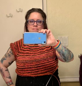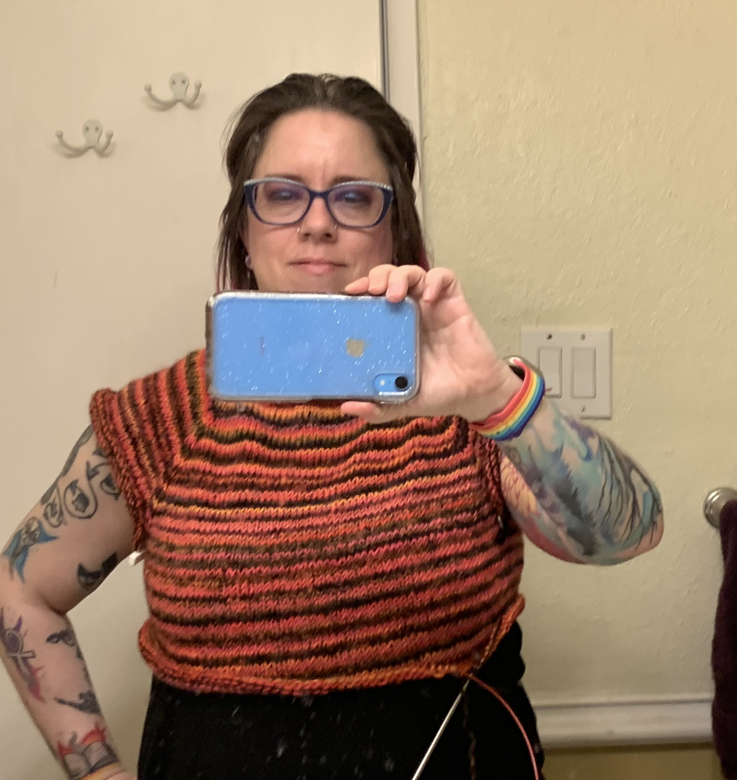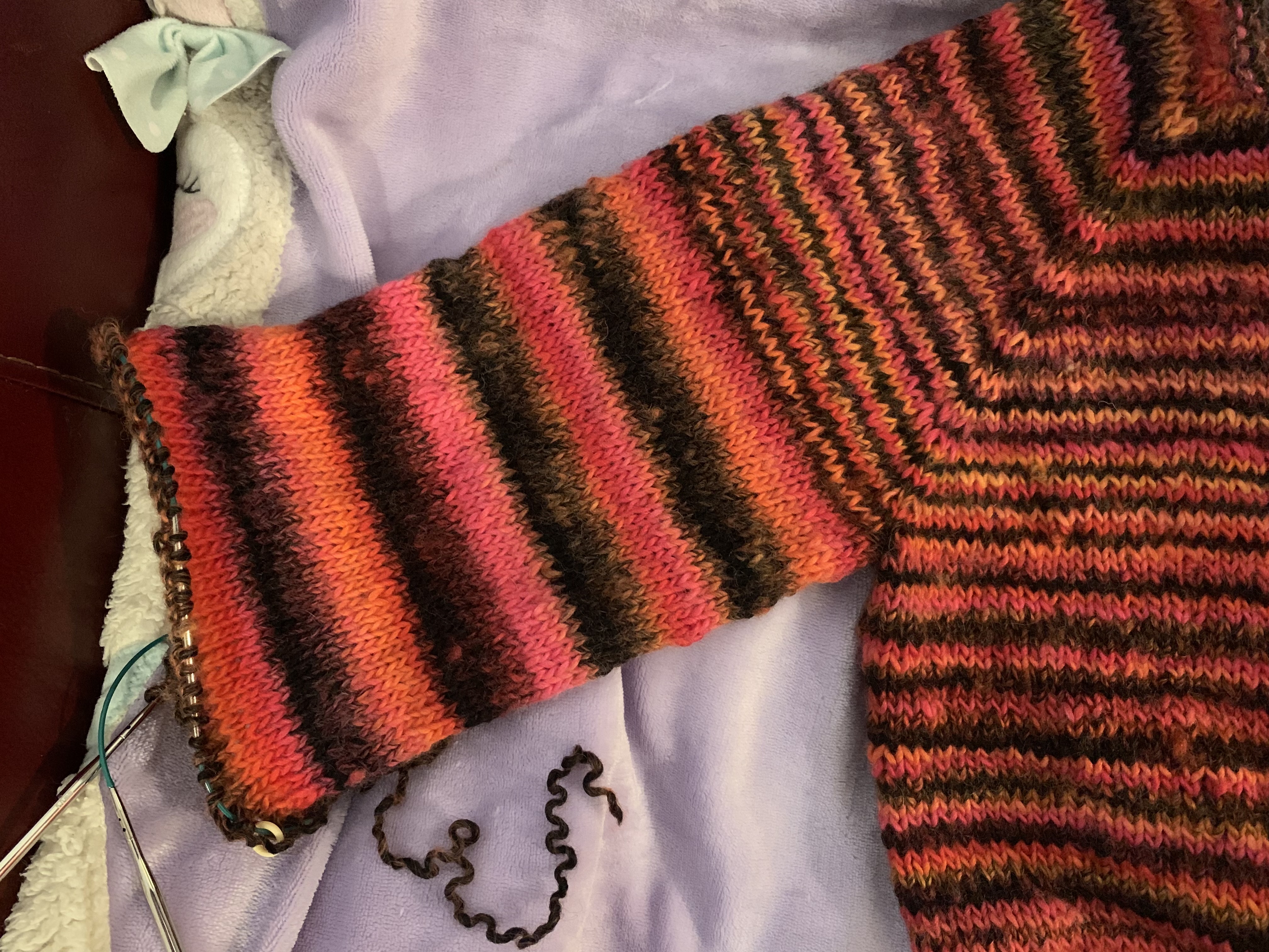 I was at least ten rows into the pattern with the yarn when I realized that it was a semi solid color which was hard to tell simply looking at the ball of yarn. So I still ended up with a striped fabric in the end. Just more on the subtle end.