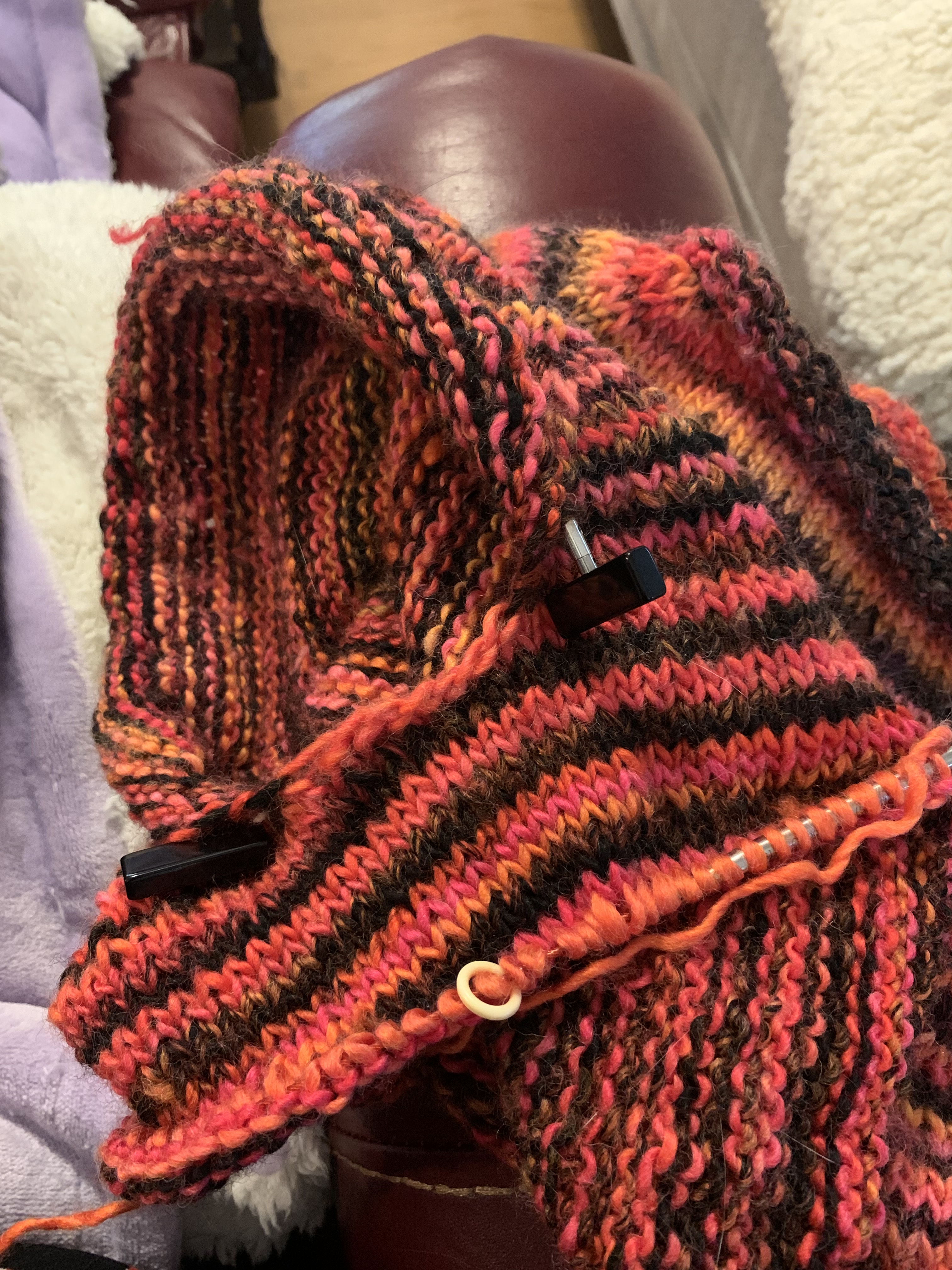 In the end I used 6 skeins of Noro Retro which ends up being 606.0 meters (662.7 yards), 300 grams. I should also mention that Noro Retro has a thick yarn/thin yarn situation going on so the texture of the fabric is varied. I have not blocked it yet to it’s final form. Primarily because it’s not going to get worn unless it goes to someone else. (Little known fact about me – I don’t actually wear shawls/wraps even though I love making them.)